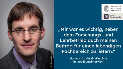 ![]()  ![]()  Beitrag für einen lebendigen Fachbereich 14.04.2022 50 Jahre Fachbereich: Interview mit unserem Alumnus Dr. Martin Girschick Während unseres Jubiläumsjahres stellen wir einige aktuelle und ehemalige Mitglieder unseres Fachbereichs vor. In diesem Beitrag sprechen wir mit unserem Alumnus Dr. Martin Girschick und erfahren unter anderem, warum Darmstadt für ihn die erste Adresse für das Informatikstudium war und von seinem besonderen Engagement als wissenschaftlicher Mitarbeiter, der über mehrere Jahre Programmierwettbewerbe für Studierende organisierte.