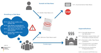 Als Konsequenz im Umgang mit Fake News befürwortet eine große Mehrheit der Teilnehmer (81 Prozent) eine schnelle Reaktion der zuständigen Behörden. Generell lag die Zustimmungsquote für Vorschläge (zum Beispiel Verpflichtung der Betreiber, Verschärfung der Strafvorschriften oder Einrichten staatlicher IT-Abwehrzentren) bei 72 Prozent.