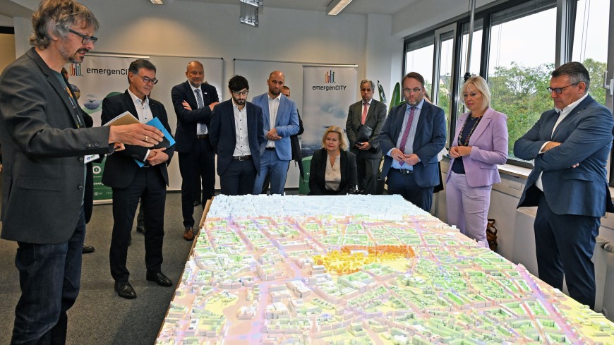 Wie resiliente, digitale Lösungen die Notfallkommunikation in einem Stadtquartier verbessern können, ließen sich die Gäste im Labor des LOEWE-Zentrums emergenCITY an der TU Darmstadt zeigen. Timon Gremmels, Hessens Wissenschaftsminister sagte: „In emergenCITY arbeiten die Forschenden an Lösungen, die in Krisenfällen einen Notbetrieb sicherstellen und schnelle Hilfe und die Rückkehr zur Normalität ermöglichen sollen. emergenCITY zeigt damit eindringlich, welche wichtige Rolle unsere Hochschulen und außeruniversitären Forschungseinrichtungen für die Bewältigung der Herausforderungen unserer Zeit spielen.“ Seit 2020 unterstütze das hessische Wissenschaftsministerium die Forschenden mit rund 22 Millionen Euro.