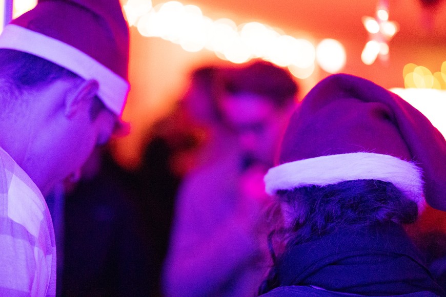 Obwohl der Schnee mittlerweile in einen Nieselregen übergegangen war, nutzen viele der Anwesenden noch die Gelegenheit zum Austausch bei der Nikolausfeier der Fachschaft mit Glühwein und Waffeln.