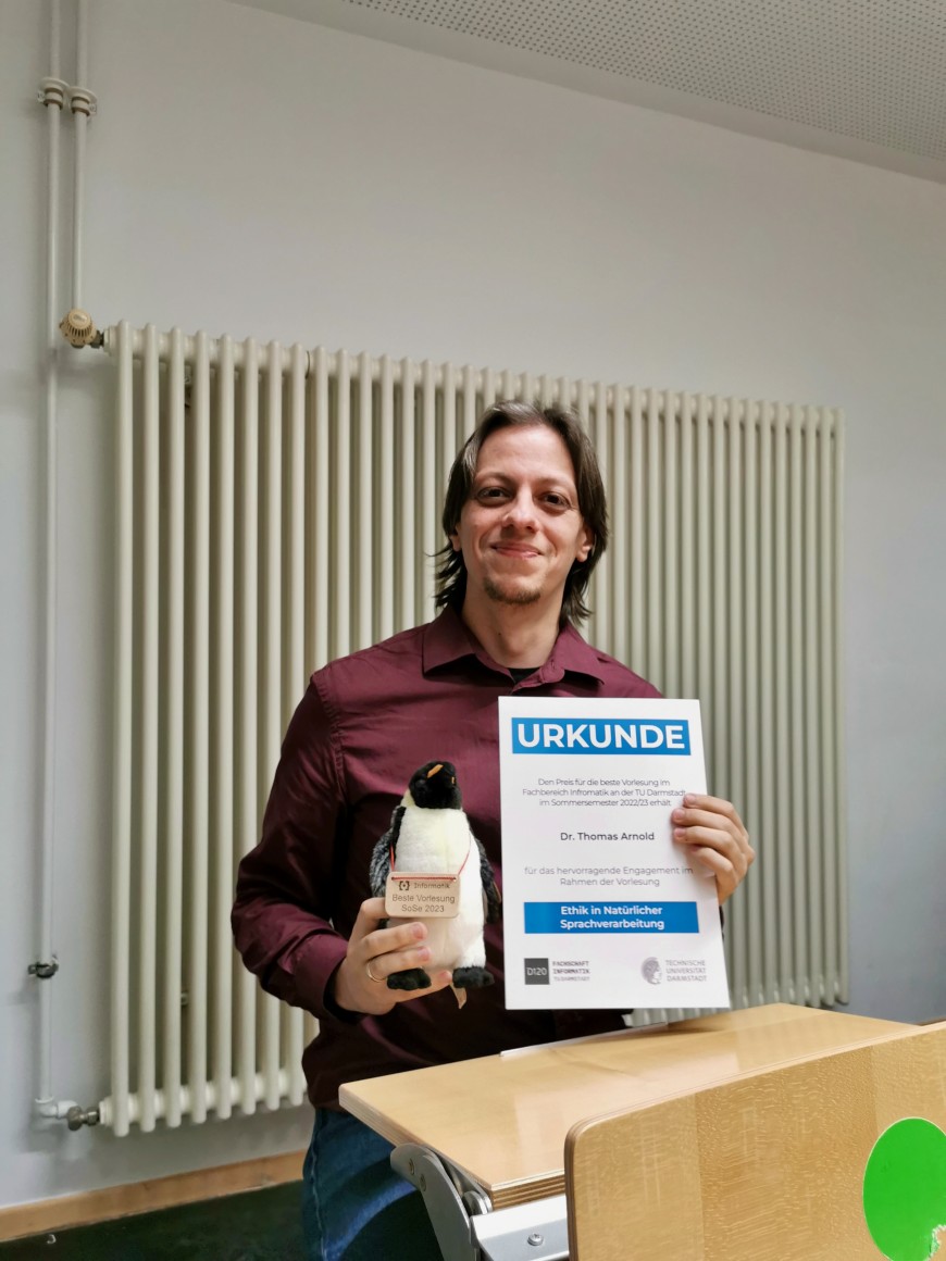 - The prize for the best lecture of the summer term 2023 went to Dr Thomas Arnold for the course Ethics in Natural Language Processing.