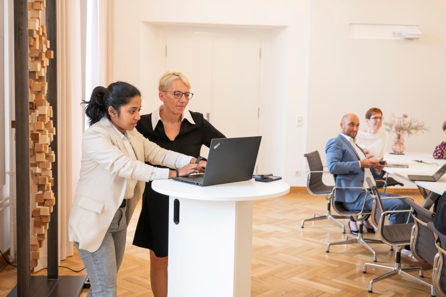 Gowri Chandran, Dr. Kasra Edalat und Professor Thomas Schneider vom Fachgebiet Cryptography and Privacy Engineering skizzierten Entwicklung und Fortschritte der Kryptographie und stellten exemplarisch dar, welche Innovationen aus der Grundlagenforschung nun fester – und vielfach unbemerkter – Bestandteil im Alltag digitaler Kommunikation sind. Mit EMC² konnten die Teilnehmenden des Besuchs live ein Tool testen, das Ende-zu-Ende-verschlüsselte Kommunikation auf mehreren Kanälen ermöglicht. Dass die TU Darmstadt vernetzt mit vielfältigen Partner:innen an den Lösungen für übermorgen arbeitet, zeigte auch ein Einblick in ein im Rahmen der Kooperation der Allianz der Rhein-Main-Universitäten (RMU) mit der Akademie der Polizei Hamburg durchgeführtes Projekt. Ziel war die rechtliche Beurteilung und Identifikation möglicher technischer Lösungen, wie sensible Daten zwischen Strafverfolgungsbehörden ausgetauscht werden können.