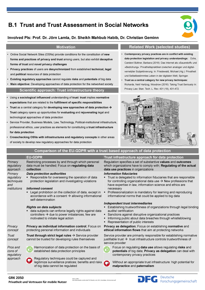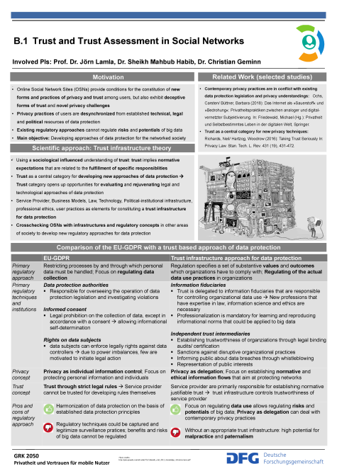 Since at least the so called ”Snowden-revelations” one can assume a crises of trust regarding the constitution of digital infrastructures. This widely discussed crises relates to complex trust relations among various actors like states, internet organizations as well as users of digital infrastructures. Given that problems of trust in the digital world are often discussed with regard to objections of privacy also the contested status of privacy is revealed when the constitution of collective trust resources is challenged.1 However, the various challenges that are related to privacy and trust have not led to digital abstinence. On the contrary, in connection with the huge popularity of Online Social Network Sites (OSNs) we have to deal with the fact that digital mediated practices have already become a relevant component of our daily lives. Therefore, it becomes clear why studying privacy and trust in the context of OSNs is related to inherently ambivalent issues. On the one hand, OSNs promote possibilities for the constitution of new forms of privacy and trust in digital environments. On the other hand, with respect to inappropriate usage of user data through state organizations or serivce providers and ethical concerns of Big Data technologies, there is no doubt that OSNs generate a lot of novel challenges concerning privacy and trust.2 From this perspective, there is a specific need for developing new criteria and regulatory techniques of data protection that can deal with the complex socio-technical dynamics of privacy and trust in OSNs.