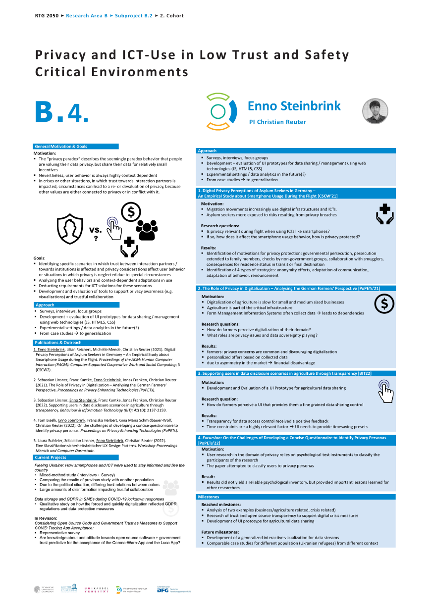 The research area B.4 deals with privacy and trust in different contexts, in which other values collide or coincide with user interests for privacy. For example, these contexts can be crises where privacy often is in contradiction to pragmatic solutions for help using digital tools. In these contexts, different incentives collide and lead to complex user behaviors and decision making. At the same time, trust might by affected due to uncertainty or a dynamic course of events, which poses additional challenges for user collaboration in these contexts. Consequently, the goal of the research is to explore privacy and trust within these circumstances and find technical ways to support users to leverage information and communications technology (ICT). The main interest is settled in the context of crisis management and crisis informatics or in the context of critical (digital) infrastructures.