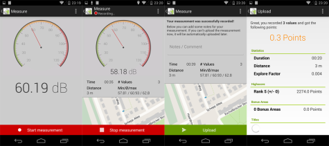This is the motivation for Noisemap. It lets you measure noise pollution using your Android smartphone. The complete measurement process for the Android application is pictured below. The data is then uploaded and to www.da-sense.de. Here it is processed and visualized, in order to create high resolution noise pollution maps.