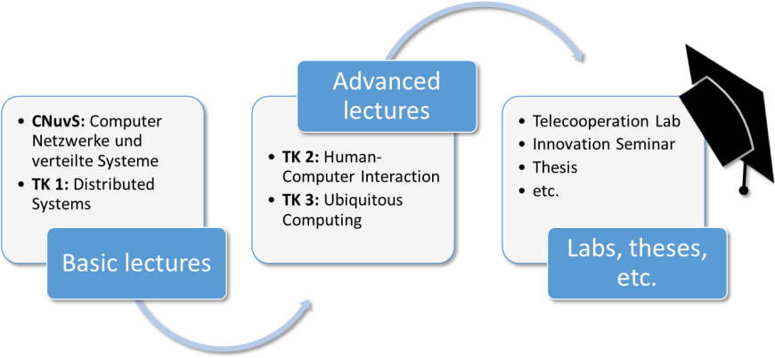 - Among the TK series of fundamental courses, „TK3: Ubiquitous Computing“ is closest to our research. It provides a comprehensive introduction to topical approaches and links them to our research fields described in this booklet: cooperation, interaction, and protection. Exercises constitute half of the four hour per week course.